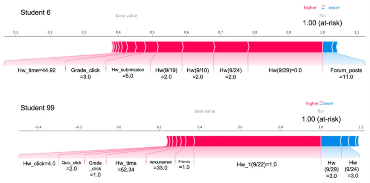 이로부터 전체 수강생에 대한 global explanation과 함께 각 학생별 local explanation을 활용할 때, 각 학생에게 필요한 맞춤형 교육적 조치를 제공할 수 있는 가능성을 엿볼 수 있습니다.