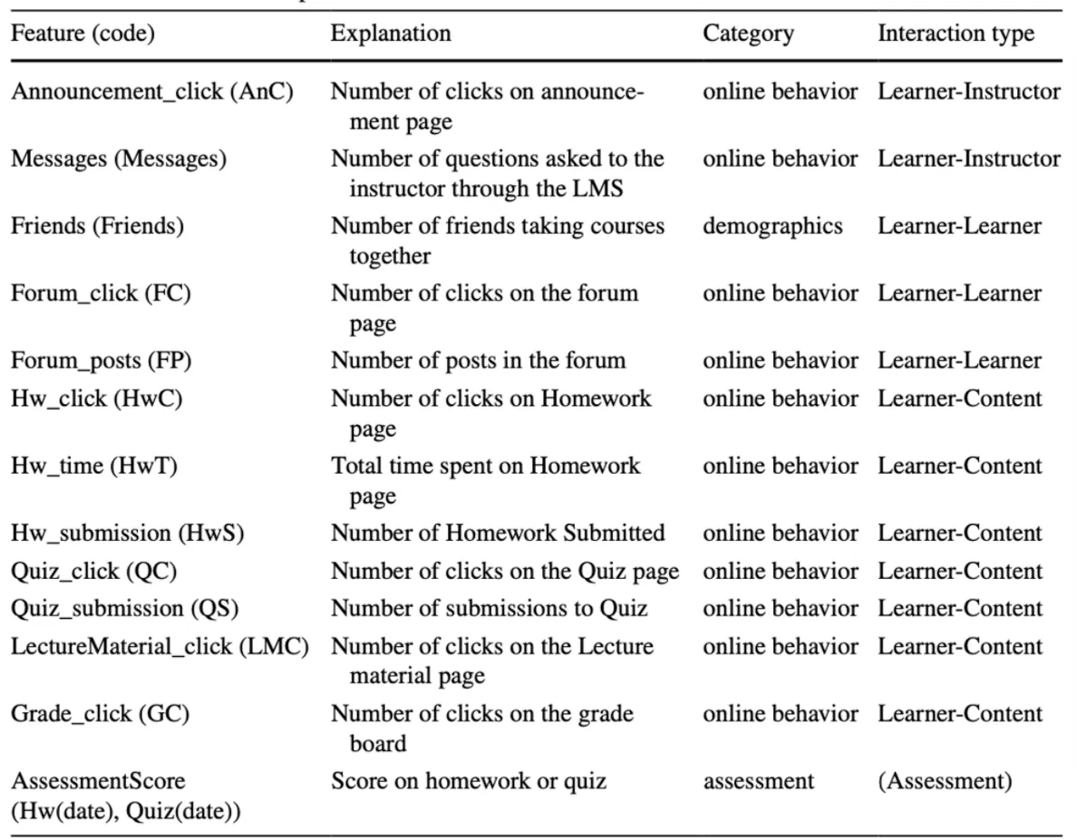선행 연구 분석: 50개의 선행 연구 분석을 통해, 관련 task에서 사용될 수 있는 속성들을 크게 다섯 가지의 카테고리(학생의 인구통계적 정보, 과거 학교급에서의 학습 성취, 온라인 행동 양식, 학습 관련 내적 속성, 해당 강좌에서의 평가 점수)로 분류합니다.