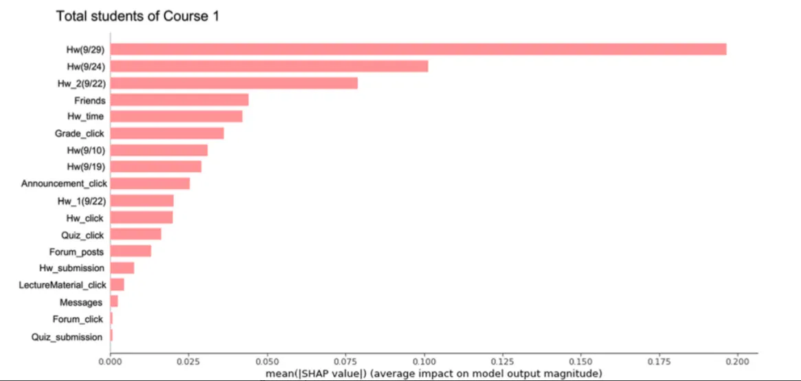강좌1을 수강하는 전체 학생들의 분류 결과에 대한 설명(global explanation)은 아래와 같습니다. 강좌1 수강생들의 위험군 판단에는 9/29 과제 성적(Hw 9/29)이 가장 큰 영향을 미쳤으며, 퀴즈 제출 횟수(Quiz_submission)가 가장 미미한 영향을 미친 것을 알 수 있습니다.