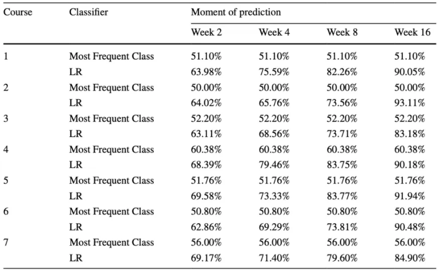 AUC와 F1-score를 전반적으로 고려했을 때 가장 우수한 성능을 보인 logistic regression의 실험 결과를 각 코스별 most frequent class의 비율과 비교한 결과는 아래와 같습니다.