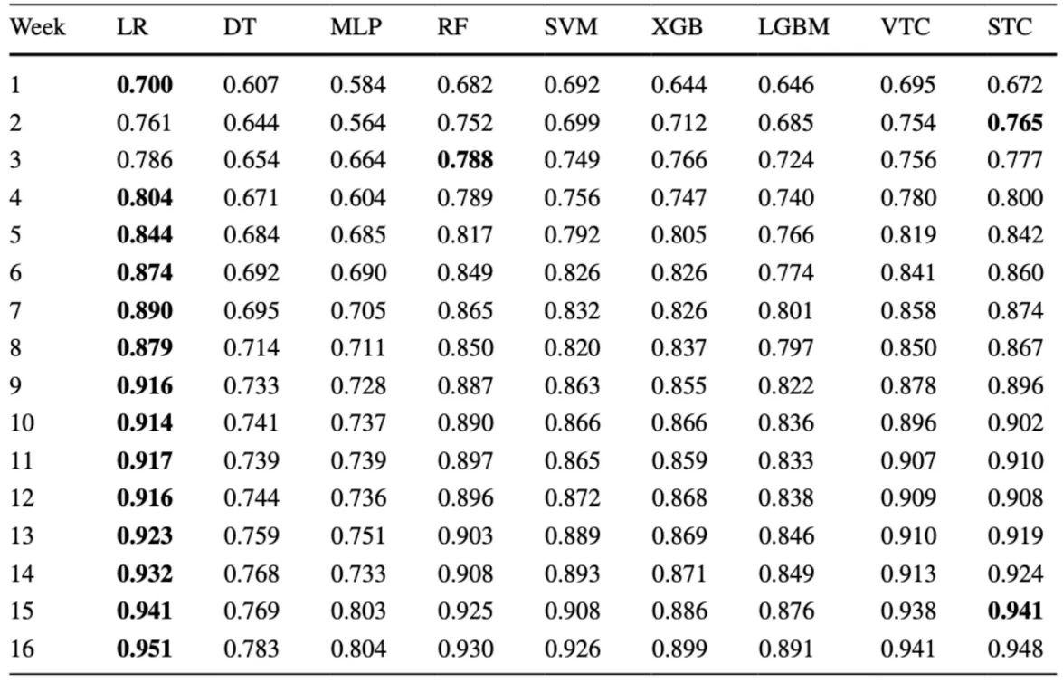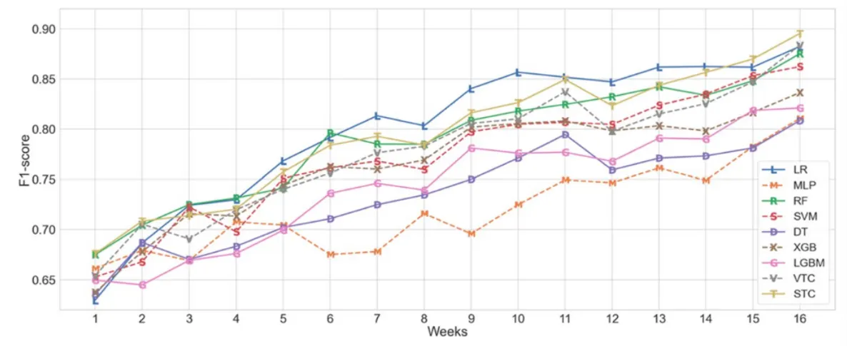 각 강좌를 수강하는 학생들 중 전체 학생들의 평균 점수 미만의 성적을 보인 수강생을 ‘위험군’으로 분류하고, 위험군 학생들을 예측하는 task를 하기 위해 다음과 같은 머신러닝 알고리즘이 사용되었습니다. 전반적으로, 전통적인 머신러닝 모델들과 최근 주목받는 앙상블 기법들이 사용되었습니다.
