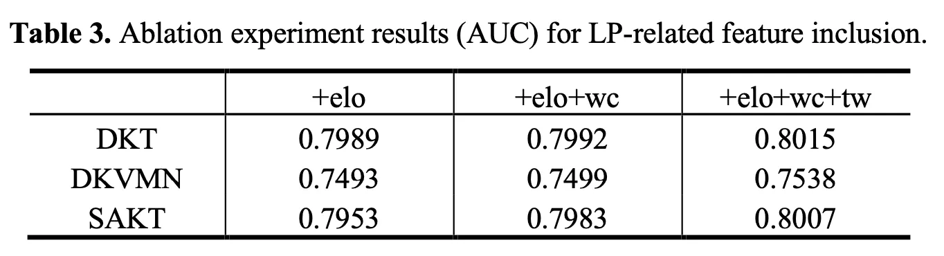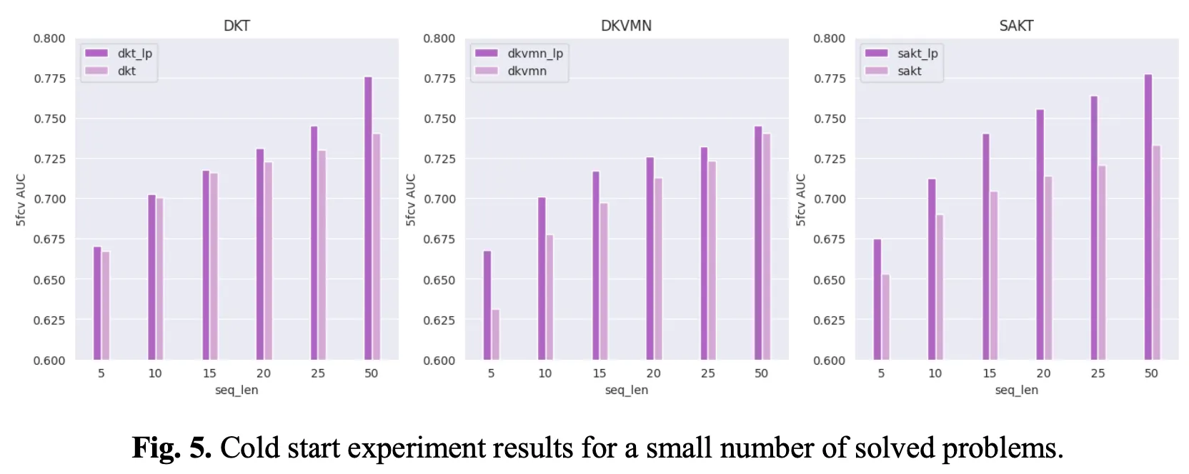 In summary, using learners’ LP information can improve the performance of KT models, and this information is effective in mitigating the cold start problem.