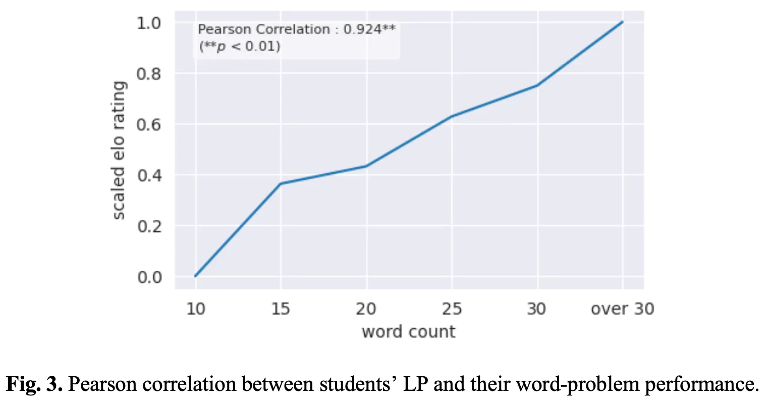 The Pearson correlation between the length of the math problem and the average Korean Elo rating score was examined for students who correctly responded to the problems to investigate the relationship between LP and math problem-solving performance. The length of a mathematical problem is defined as the number of words in a sentence. Pearson correlations were examined using Python SciPy 1.10.0 [38].