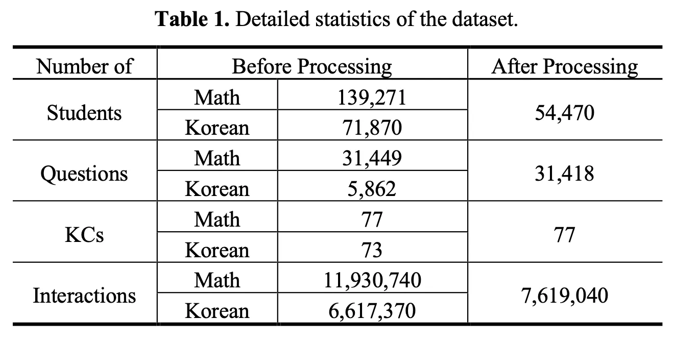 In this study, data collected in 2021 on students’ Korean and math problem-solving histories were used. First, LP information of students was extracted using Korean problem-solving data. The Korean problem-solving data included 71,870 students, 5,862 questions, 73 KCs, and 6,617,370 interactions. Using the learner’s LP information, we attempted to trace the learner’s knowledge in other subjects (math in this study). A total of 139,271 students, 31,449 questions, 77 KCs, and 11,930,740 interactions were included in the math problem-solving data. The data of students who solved less than five Korean and math problems were removed. As a result, data of 54,470 students, 31,418 questions, 77 KCs, and 7,619,040 interactions were used. Table 1 lists the detailed statistics of the dataset.