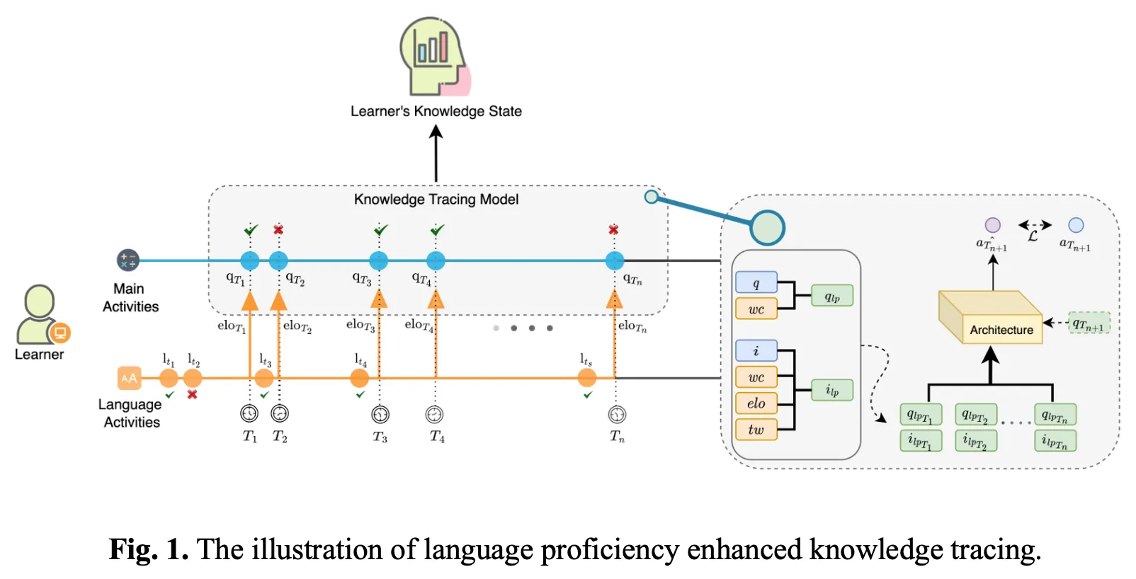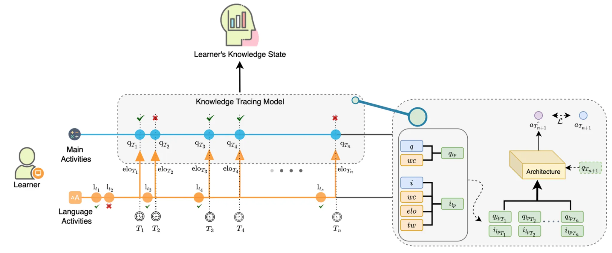 Fig.1 shows the structure of the LP-enhanced KT model proposed in this study. indicate the questions of main activities, the math problem-solving event, whereas indicate the questions of language activities, which is the Korean problem-solving event. represent the timestamps of the main activities and represent the timestamps of the language activities. The Elo rating score calculated from the results of language activities up to is used for timestamp .