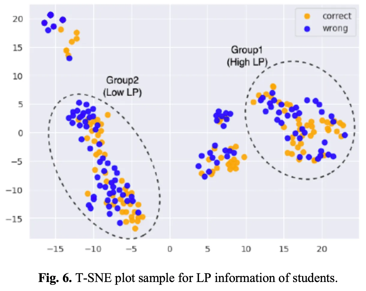 Modeling the learner’s state of knowledge in light of LP has potential as a supplement for educational interventions. Fig.6 depicts the visualization of LP information from students who solved a random word problem using a T-SNE plot [25]. The students’ LP information was encoded using a trained LP-enhanced KT model. Correct responses are marked in orange, while incorrect responses are marked in blue.
