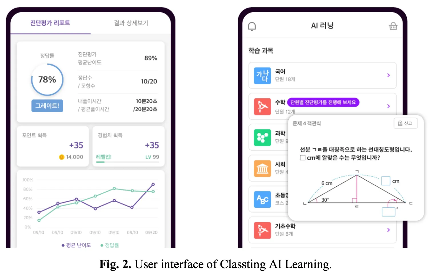 Data from Classting AI Learning1 were used in this study. Classting AI Learning is an online learning platform for K-12 that provides contents in Korean, English, mathematics, social studies, and science. Classting AI Learning currently has approximately three million users and is accessible via the web, Android, and iOS applications. Fig.2 shows the user interface of Classting AI Learning.