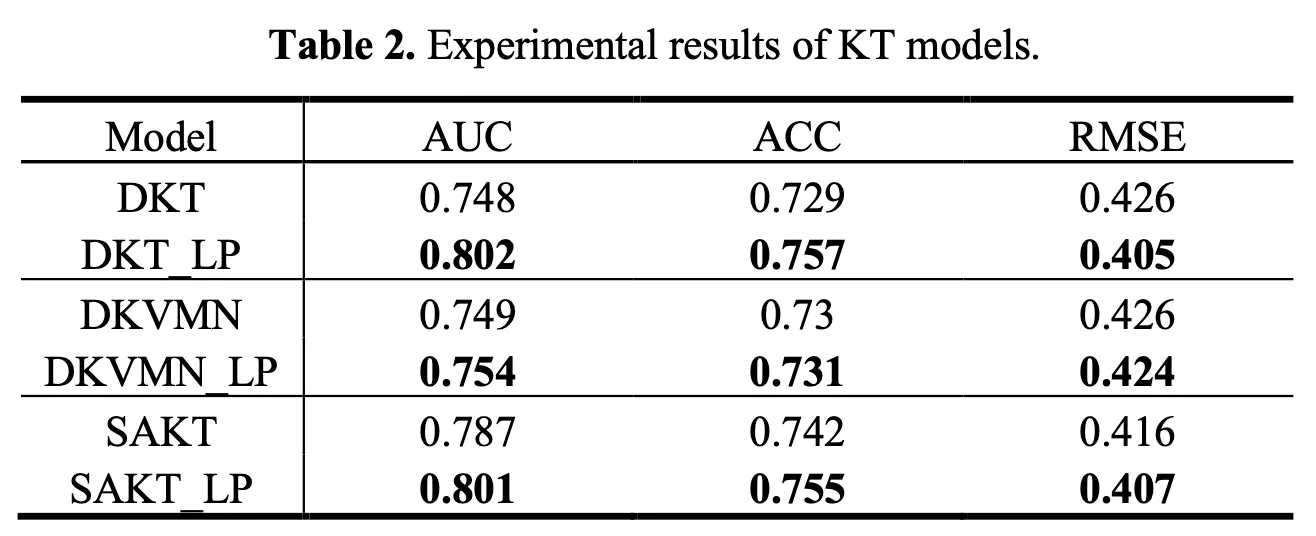 RQ2 : Is it possible to improve the performance of the KT models by incorporating LP information?