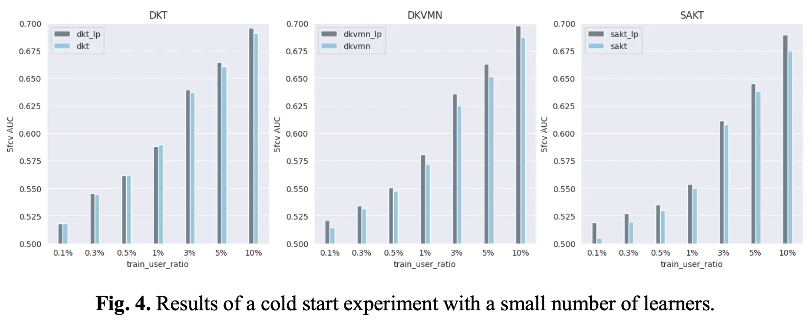 Similar to many other tasks in machine learning, the KT task has a cold start problem. Cold start problems can be classified into two scenarios [40,44]. The first scenario is a case of constructing a KT model with a small number of students, while the second scenario is a case of constructing a KT model with a short learning activity. We examined whether the LP information could alleviate the cold start issue in these two scenarios. In the first scenario, the performance was compared by reducing the number of training users from 10% to 0.1%. In the second scenario, performance was compared by reducing the sequence length of the training data from 50 to 5.