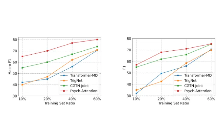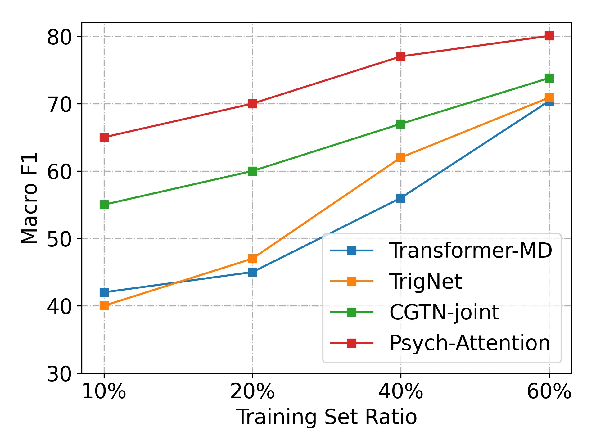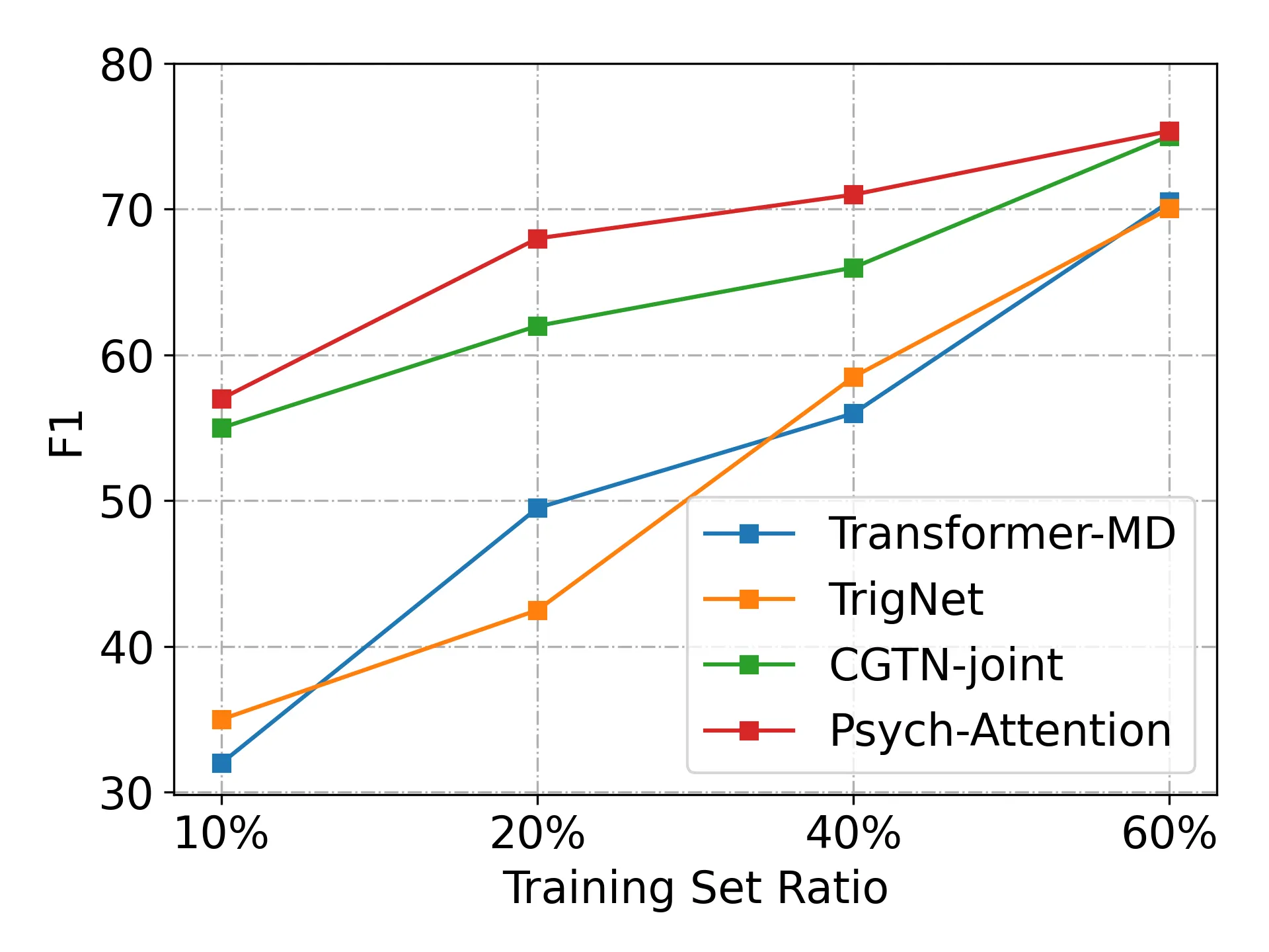 We observe that the number of label definitions does not produce huge impact on ultimate performances once the solid definition implying valid psycholinguistic knowledge is provided for generating our desired attention maps as shown. We also compare our approach with three baseline models to evaluate the robustness in low-resource settings. We set 10%, 20%, 40%, and 60% of training sets respectively to evaluate our strong performances in various low-resource settings. Following the prior work, we run our approach 10 times with different seed numbers and observe the best performances overall settings.