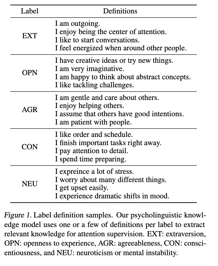 Most work on personality detection studies the model performance with an evaluation metric such as Big Five models. The Big Five models utilize four different psychological attributes of analyzing how one gains energy (extraversion), how one processes information (openness to experience), how one makes decisions (agreeableness), and how one presents themselves to the outside world (conscientiousness), and how one he feels anxiety and depression (neuroticism).